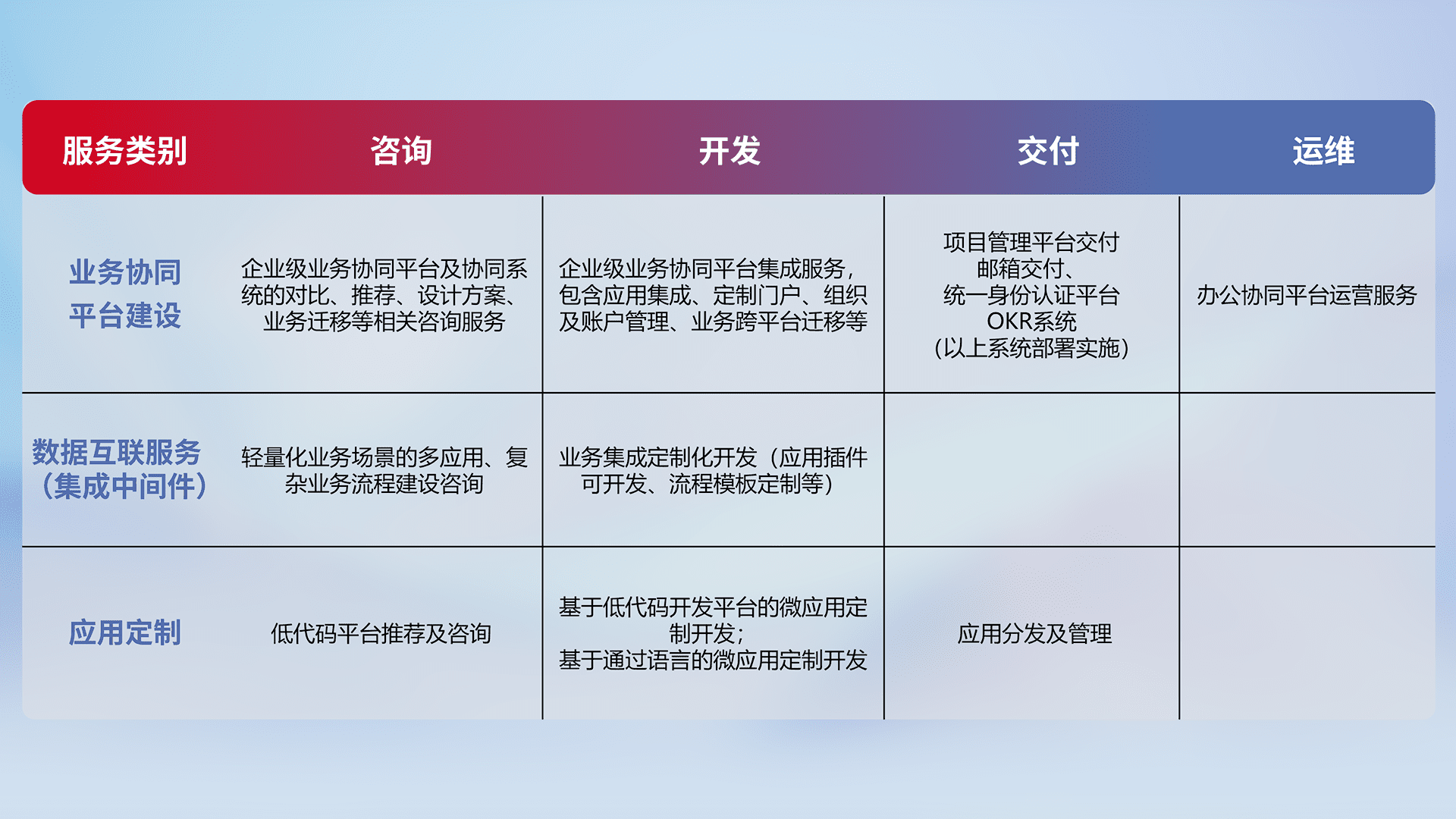 针对钉钉、、、企微、、、、IDaas等平台级产品提供产品的规划、、、、方案、、、、交付、、、定制化开发等服务,,,,实现如统一协同办公、、、智能客户服务、、、、混合会议管理、、智能数据查询、、、等业务场景,,,实现数字化转型。。